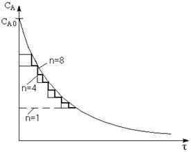 Можно видеть, что каскад из n реакторов идеального смешения значительно эффективнее, чем единичный реактор данного типа, причем с увеличением n каскад по удельной производительности все более приближается к модели идеального вытеснения. Это иллюстрируется кинетическими зависимостями для
