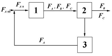 | Схема потоков при рециркуляции непревращенного реагента. 1 – реакционный узел; 2 – блок отделения непревращенного реагента; 3 – блок рециркуляции. |