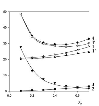 | Рис. Зависимость переменных слагаемых себестоимости от степени конверсии. 1 – материальные затраты без утилизации побочного продукта; 1' – то же с утилизацией; 2 – энергетические затраты, связанные с выделением и рециркуляцией непрореагировавших реагентов; 3 – амортизационные отчисления; 4 – сумма переменных затрат в себестоимости продукта без утилизации побочных продуктов; 4' – то же с утилизацией. |