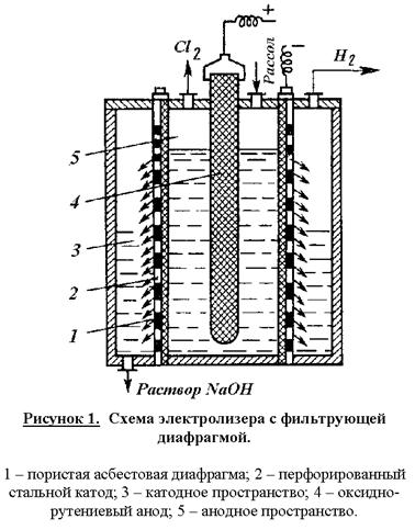 Электролиз раствора NaCl с твердым катодом и фильтрующей диафрагмой