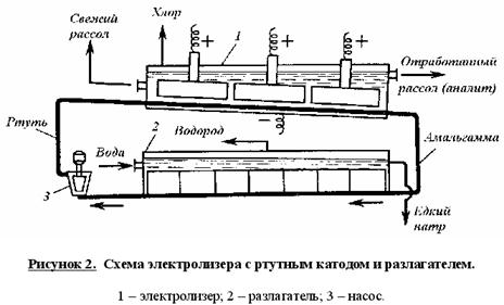 Глубоко очищенный концентрированный раствор NaCl подают в наклонный удлиненный электролизер, по дну которого самотеком, противотоком рассолу, движется ртуть, служащая катодом. Над ртутью расположен горизонтальный оксидно-рутениевый (или перфорированный графитовый) анод, погруженный в рассол. Анодная жидкость, содержащая непрореагировавший NaCl, выводится из электролизера совместно с хлор-газом, от которого отделяется в сепараторах и продувочных колоннах (на схеме не показаны). Хлор подают на осушку, а обесхлоренный рассол после очистки от ртути и примесей насыщается каменной солью и возвращается в электролизер. Амальгама натрия из электролизера перетекает в наклонный реактор-разлагатель, где движется противотоком дистиллированной воде, подаваемой в количестве, обеспечивающем получение 45%-ого раствора NaOH. На дне разлагателя размещены гребенчатые графитовые плиты, образующие с амальгамой короткозамкнутый гальванический элемент NaHg n [NaOH] С. Отводимый гидроксид натрия отделяют в сепараторах от водорода и передают потребителям. Ртуть, вытекающую из разлагателя, ртутным насосом перекачивают в электролизер.