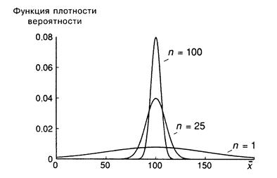 (доказательство этого факта мы опускаем), она тем меньше, чем больше размер выборки, и, значит, тем сильнее «сжата» функция плотности вероятности для