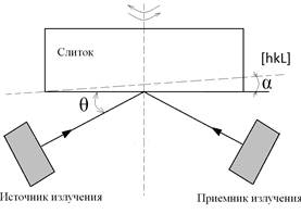 Торцевую поверхность слитка обрабатывают так, чтобы она была перпендикулярна оси слитка. Слиток закрепляют на предметном столике, и на поверхность слитка направляют пучок рентгеновских лучей под углом, равным углу рассеяния Q на искомой кристаллографической плоскости. В одной плоскости с осью слитка и осью рентгеновского пучка помешают приемник отраженного рентгеновского излучения. Наклоном слитка и вращением его вокруг оси добиваются максимальной интенсивности отраженного рентгеновского излучения. Найденное отклонение слитка относительно исходной оси и будет отклонением плоскости его поверхности от требуемой кристаллографической ориентации.