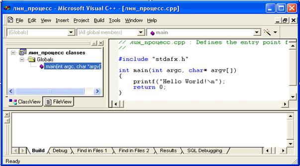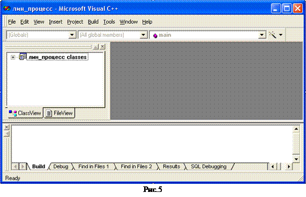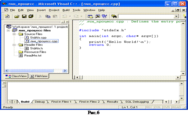 Таким образом, будет создано консольное приложение. При этом внешний вид среды Visual C++ 6.0должен выглядеть следующим образом: