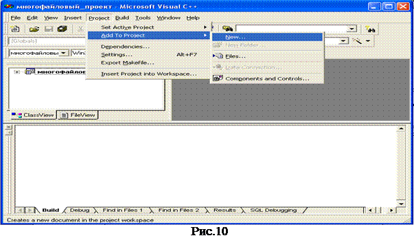 Выбрать пункт меню ProjectàAdd to ProjectàNew (для создания нового головного файла) и ProjectàAdd to ProjectàFiles… (для подключения уже созданного головного файла). Среда Visual C++ 6.0 будет выглядеть следующим образом (рис.10).