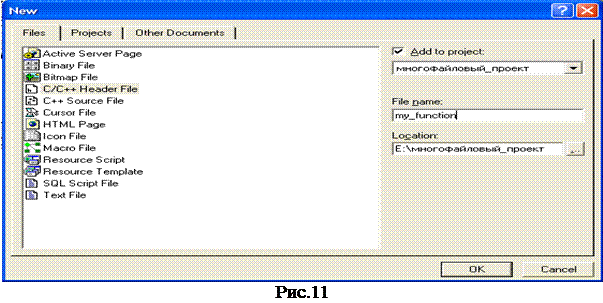 Появится диалоговое окно, в котором будет предложено выбрать тип подключаемого файла (C/C++ Header File) и, если это нужно, набрать имя создаваемого головного файла в поле File name. После этого нужно нажать на кнопку