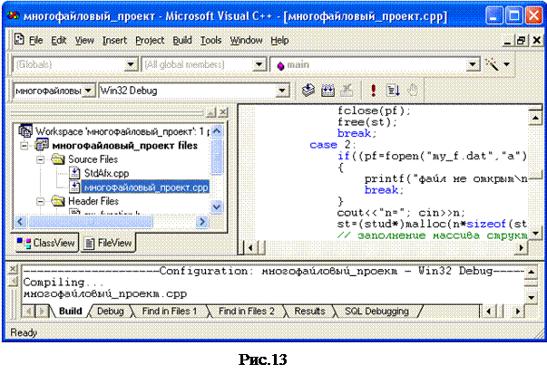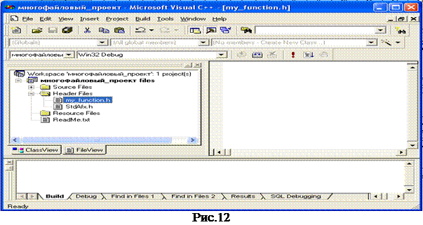 Открыв созданный головной файл, в окне редактора можно набрать текст функции. Для возможности использования созданной функции в своей программе необходимо в файле главной функции <имя_проекта>.cрр (на вкладке FileView окна рабочего пространства открыть папку Source Files) при помощи директивы #includе подключить созданный головной файл (рис.13).