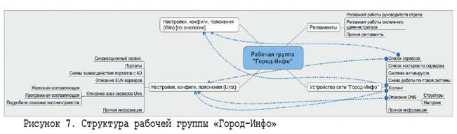 Как видно из рисунка, фактически все области работы службы системных администраторов компании здесь освещены. Разумеется, часть информации не отображена на схеме и включена в пункты «прочее», но и того, что отображено, более чем достаточно для понимания. Стрелками отображены ссылки между разделами. Множество перекрёстных ссылок находится и внутри документов, но отобразить это на схеме не представляется возможным.