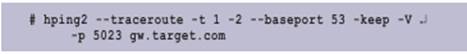 Выполняется трассировка при помощи пакетов типа UDP, исходящий порт соединения 53, а порт назначения 5023 исследуемого хоста gw.target.com. Трассировка позволяет получить информацию о структуре корпоративной сети, ее активных сетевых узлах (брандмауэры, маршрутизаторы, и т. д.).