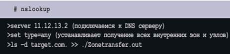 Некоторые сервисы позволяют получить злоумышленнику избыточную информацию о сети, часто уязвимы DNS-сервера, как и приведенный выше пример с конфигурацией, разрешающей трансфер зоны: