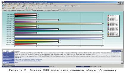 Сильной стороной DSS всегда были отчеты. После сканирования администратор получит полную информацию обо всех найденных узлах и работающих на них серверах, программах и их версиях (если возможно), включая МАС-адрес, NetBIOS-имя, имена пользователей и прочее. Если будут найдены уязвимости, то будут указаны степень опасности (Info, Low, Medium, High) и краткое описание со ссылками на ресурсы BugTraq, DragonSoft, ISS X-Force и CVE- ID (Common Vulnerability and Exposure), где можно найти более подробное объяснение. При оценке риска программа следует стандарту BS7799.