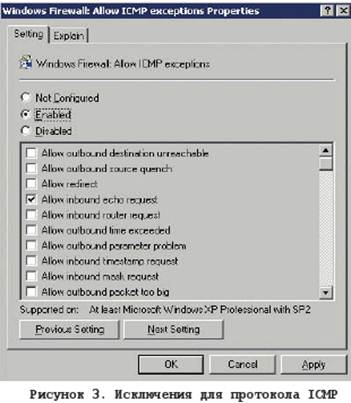 ü Allow ICMP exceptions – разрешать исключения для протокола ICMP. В соответствии с тем, что было сказано ранее про ICMP, мы разрешим только Inbound echo request (см. рис. 3).