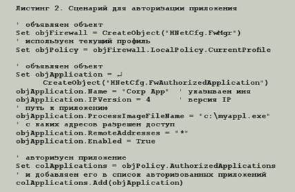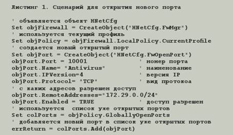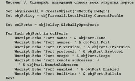 Что же делать, если у вас имеются машины, не входящие в домен, например, сеть филиала или ноутбуки сотрудников, находящихся в командировке. В такой ситуации можно прибегнуть к помощи сценариев Windows Script Host. Этот сценарий можно отправить по электронной почте, снабдив получателя соответствующими инструкциями по его запуску. Кстати, сценарий, открывающий порты на межсетевом экране, может быть также полезен при развертывании приложений, которым для работы необходимы открытые порты на firewall.