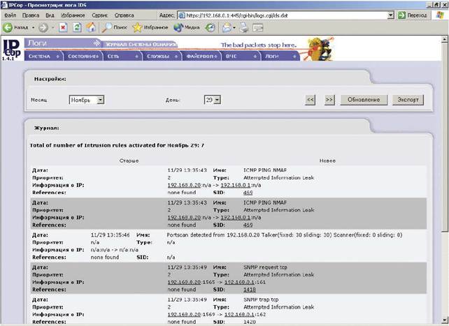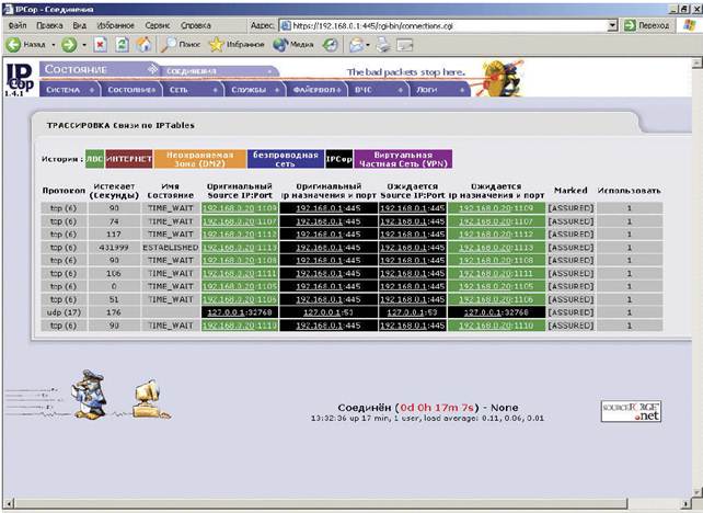 Пользователю доступны семь вкладок («Система», «Состояние», «Сеть», «Службы», «Файервол», «ВЧС» и «Логи») с подпунктами в каждой. Так, в меню «Система» можно скачать обновления нажатием одной кнопки, изменить пароли, настроить доступ по SSH, сохранить настройки на дискету, выключить маршрутизатор и ознакомиться с создателями. В меню «Состояние» – получить данные и графики о работе системы (запущенные сервисы и загруженные модули, состояние памяти и заполнение дисковых разделов и пр.), сети (в том числе таблицы маршрутизации и трассировка связи по IPTables). В подпунктах вкладки «Сеть» указываются параметры модемного соединения (только для RED). В меню «Службы» выбираются параметры и запускаются: прокси-сервер Squid и DNS-сервера, DHCP-сервер для Green-интерфейса, параметры предпочтительных Network Time Server, выставить приоритеты сервисов, включить использование NIDS Snort для тех сетевых интерфейсов, где хотите контролировать происходящее. В этом же пункте можно занести данные об IP-адресах и именах известных узлов в файл /etc/hosts, для того чтобы лишний раз не обращаться к DNS-серверам. Если необходимо запретить доступ к некоторым сайтам, то самым простым решением будет занести в этот же файл приблизительно такую конструкцию, вставив нужное имя (список некоторых «ненужных» сайтов можно найти по адресу https://ssmedia.com/utilities/hosts).
