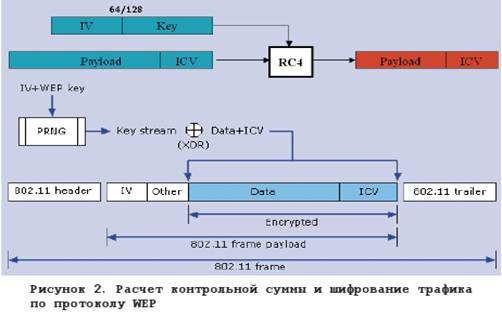 они нужны? А затем, что используемый криптоалгоритм легко вскрывается атакой по открытому тексту. Если злоумышленнику известен хотя бы один исходный байт в каждом фрейме, ключ шифрования восстанавливается без труда, поскольку различные части ключа многократно применяются к различным частям зашифрованных фреймов. Чтобы этого избежать, никакой ключ шифрования не должен использоваться дважды. Вектора инициализации автоматически изменяются с каждым пакетом, что обеспечивает «прозрачную» смену ключа, без ведома и участия пользователя (см. рис. 2).