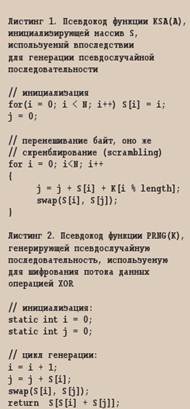 где функции KSA(A) и PRNG(К) выражаются следующим псевдокодом (см. листинг 1, 2 и рис. 4).