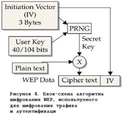 Шифрование в обоих случаях осуществляется по WEP-протоколу (Wired Equivalent Privacy – эквивалент проводной защищенности), опирающемуся на потоковый криптоалгоритм RC4. Исходные данные (data) нарезаются на фреймы (fames) с размером 1.518 бит (впрочем, размер задан не жестко и в зависимости от конфигурации оборудования он может существенно отличаться). Для каждого фрейма определяется и укладывается в пакет 32-битная контрольная сумма (ICV), вычисляемая по алгоритму CRC32. Эффективный ключ шифрования (PRNG – Pseudo-Random Number Generator – генератор псевдослучайных чисел) генерируется на основе двух ключей – 40-битного секретного ключа (secret key или WEP key), назначаемого пользователем, и 24-битного вектора инициализации (IV – Initialization Vector), генерируемого случайным образом для каждого пакета. Все вместе это называется 64-битным шифрованием и представит собой классический пример американского маркетинга по одурачиванию доверчивых пользователей. В самом деле, зачем потребителю знать, что для взлома ключа злоумышленнику достаточно подобрать всего лишь 40 бит из 64!