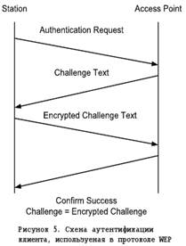 Аутентификация осуществляется по старой доброй схеме запрос/отклик (challenge/response). Клиент (Client или Station), желающий подключится к точке доступа (Access Point), посылает запрос на аутентификацию (Authentication Request). Точка доступа генерирует 128-байтовый псевдослучайный «испытательный текст» (Challenge Text) и отправляет его клиенту. Получив «испытательный текст», клиент шифрует его 64-битным ключом, полученным на основе секретного WEP-ключа и произвольного вектора инициализации. Зашифрованный испытательный текст (Encrypted Challenge Text) вместе с вектором инициализации передается на точку доступа, где происходит об ратный процесс: используя имеющийся в ее распоряжении секретный WEP-ключ и открытый вектор инициализации, точка доступа расшифровывает пакет и сравнивает полученный текст с оригинальным испытательным текстом. Если они совпадают, аутентификация считается успешной и клиенту отправляется подтверждение доступа (Confirm Success) (см. рис. 5).