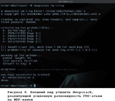 Хакеры из лаборатории H1kari of Dasb0den Labs усилили FMS-алгоритм, сократив количество необходимых пакетов с 6 миллионов до 500 тысяч, а в некоторых случаях 40/104 битный ключ взламывается всего с 3 тысячами пакетов, что позволяет атаковать даже домашние точки доступа, не напрягая их избыточным трафиком. Усиленный алгоритм атаки реализован в утилите dwepcrack, входящей в состав пакета BSD-airtools, а также в другом хакерском инструментарии (рис. 6).