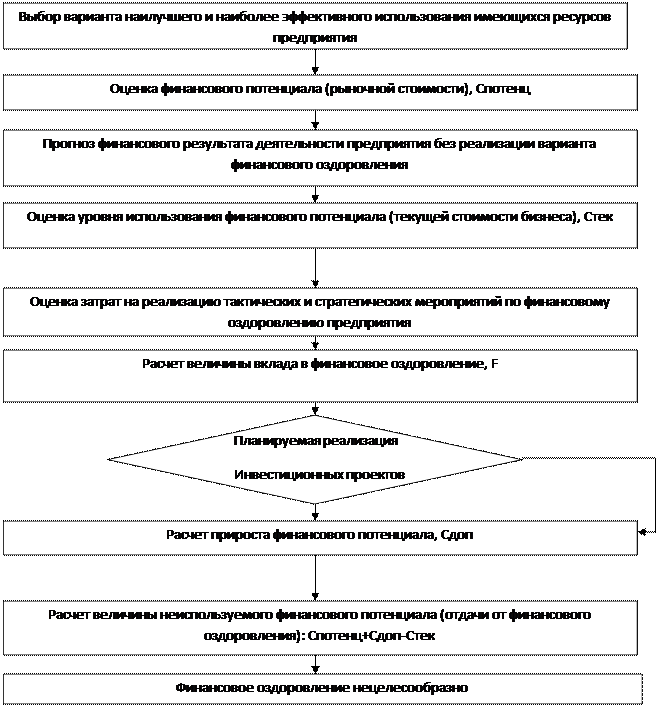 Основные процедуры предполагаемой методики оценки целесообразности финансового оздоровления предприятия представлены на рис. 10.6. В процессе оценки необходимо доказать, что величина затрат, необходимых для оздоровления кризисного предприятия (величина вклада), не превышает величину неиспользованного финансового потенциала этого предприятия (величину отдачи финансового оздоровления).