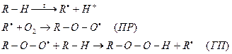 согласно теории цепных реакций, подвижный атом водорода отрывается от молекулы и образуется свободный радикал. Он реагирует с кислородом, образуется пероксидный радикал. Пероксидный радикал реагирует с другими молекулами окисляющихся веществ, образуется гидропероксид и новый радикал. Гидропероксид распадается с образованием новых радикалов – цепная реакция.