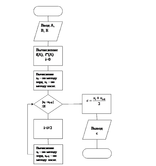 Комбинированный метод заключается в комбинировании метода хорд и метода касательных. На каждом четном шаге решение ищется по методу хорд, а на нечетном – по методу касательных. Процесс завершается, когда модуль разности между соседними приближениями станет не больше заданной точности. В качестве приближенного решения выбирается среднее арифметическое соседних приближений.