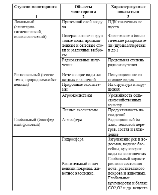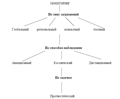 Экологический мониторинг (понятие введено Стокгольмской конфе-ренцией в 1972 году) – это наблюдение, оценка, анализ состояния изменения окружающей природной среды. Основной принцип мониторинга – непрерыв-ное слежение. Но мониторинг это не только слежение и оценка фактов, но и экс-периментальное моделирование, прогноз и рекомендации по управлению состоя-нием окружающей природной среды. Задачи по оценки окружающей среды ре-шают с помощью математического моделирования на ЭВМ. Виды мониторинга представлены на рисунке.