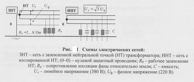 В промышленности используют два вида электрических сетей: четырехпроводные с заземлённой нейтральной точкой (ЗНТ) и трехпроводные с изолированной нейтралью (ИНТ),