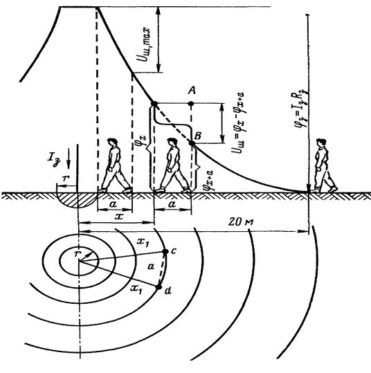 Из-за характера кривой спада потенциала видно, что шаговое напряжение убывает по мере удаления от заземлителя и увеличивается по мере приближения к нему.