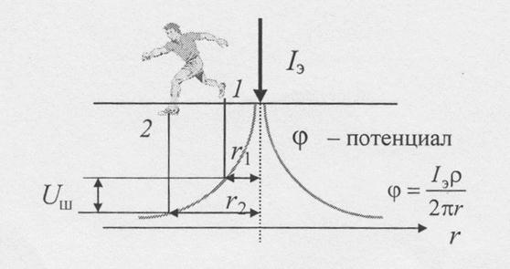 Напряжение между двумя точками на поверхности земли U1-2= φr1- φr2