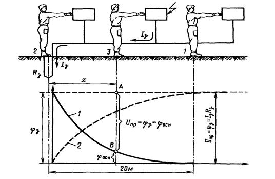 Рис. Напряжение прикосновения. 1- φос(x); 2 -