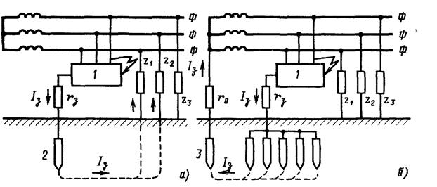 Рис. 2. Принципиальная схема защитного заземления: а - в сети с изолированной нейтралью; б – в сети с заземленной нейтралью выше 1000В; 1 – оборудоваение; 2– заземлитель; Rз – сопротивление защитного заземления, Ом; R1, R2, R3 – сопротивления фаз относительно земли