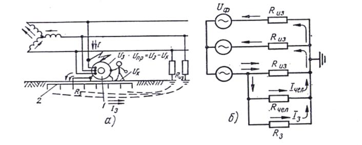 Рис. 3. Схема работы защитного заземления: а– общая схема, б–схема замещения;, 1– корпус, 2– заземлитель