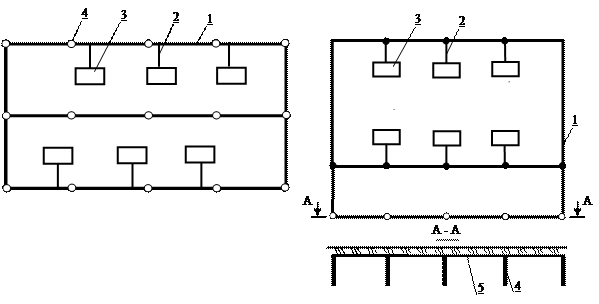 Рис 4. Схема заземляющего устройства: а – контурное; б – выносное; 1 – магистраль заземления; 2 – заземляющие проводники; 3 – заземляемое оборудование; 4 – вертикальные заземлители; 5 – соединительный горизонтальный проводник.
