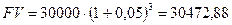 Вклад 30000 рублей помещен в банк под 5% годовых. Определить сумму на счету через 3 года?