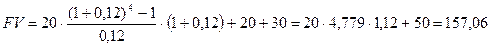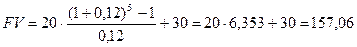 б) как срочный аннуитет пренумерандо с А = 20, n = 4, r = 12 % и единовременное получение сумм 20 и 30 млн. руб. На основании формулы (3.25) имеем: