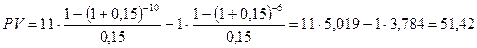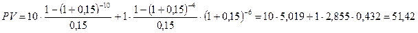 Сдан участок в аренду на 10 лет. Арендная плата будет осуществляться ежегодно по схеме постнумерандо на следующих условиях: в первые шесть лет по 10 млн. руб., в оставшиеся четыре года по 11 млн. руб. Оценить приведенную стоимость такого договора, если процентная ставка равна 15 %?