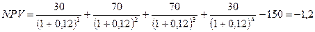 Проект, рассчитанный на 4 года и требующий инвестиций в 2009 году размере 150 млн. руб., гарантирует следующие доходы: в 2010 году – 30 млн. руб.; в 2011 – 70 млн. руб.; в 2012 – 70 млн. руб.; в 2013 – 30 млн. руб. Принимать ли этот проект, если стоимость капитала 12 %.