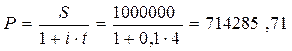 Из условия задачи следует: n = 4, i = 10 %, S = 1 000 000 руб. По формулам (1.2.1) и (1.2.3) получаем современные стоимости для простых и сложных процентов