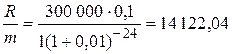 Определить величину ежемесячного платежа R ренты, современная стоимость которой за 2 года составит 300 000. Проценты начисляются в конце каждого месяца по сложной ставке в 12 % годовых.
