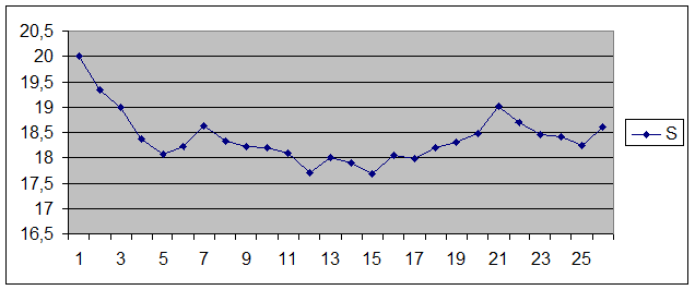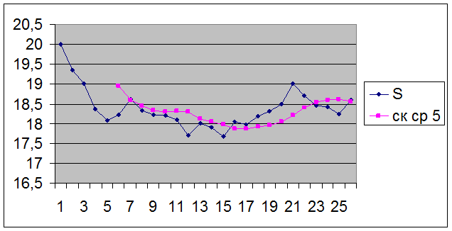 т.е. скользящее среднее дает завышенное значение цены. Аналогично, прогноз цены в 7-й день S 7 = 18,6199 будет равен