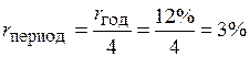 В условии приведена годовая ставка, но начисление процентов ведется каждый квартал. Значит, процентная ставка за период равна