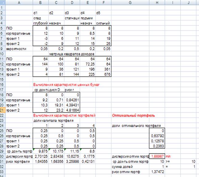 · В ячейку J31 введем 10 нижнюю границу ожидаемой доходности mниж.