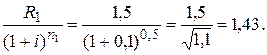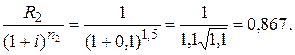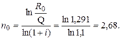 Исходное платежное обязательствосостоит из трех платежей:первый платеж в размере R 1 = 1,5 млн руб. производится через n 1 = 0,5 года, второй платеж в размере R 2 = 1 млн руб. производится через n 2 = 1,5 года, третий платеж в размере R 3 = 2 млн руб. производится через n 3 = 2,5 года после начала контракта. Определить срок n 0 выплаты консолидированного платежа R 0 = 5 млн руб. Расчеты производятся по сложной схеме процентов 10 % годовых.