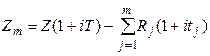 Схема погашения долга по правилу торговца состоит в следующем. Вычисляется сумма долга с начисленными на весь срок и процентами Z (1 + iT). Сумма не изменяется до полного погашения. Из этой суммы в момент поступления платежа вычитается его величина с начисленными до конца срока процентами Rj (1 + i tj). Таким образом, остаток долга в конце срока будет равен