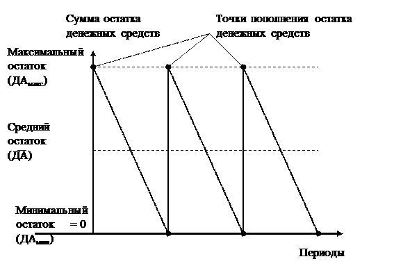 Исходными положениями Модели Баумоля является постоянство потока расходования денежных средств, хранение всех резервов денежных активов в форме краткосрочных финансовых вложений и изменение остатка денежных активов от их максимума до минимума, равного нулю.