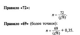 Эти правила позволяют определить за какой срок n вложенный капитал увеличится в 2 раза при известной ставке процента i (которая выражается в процентах, а не в долях единицы) Данные правила дают весьма точный результат, отклонения достаточно малы и ими можно пренебречь.