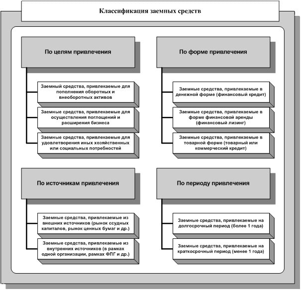 Источники и формы привлечения заемных средств весьма разнообразны. Классифицировать привлекаемые организацией заемные средства можно следующим образом.