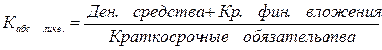 1. Коэффициент абсолютной ликвидности. Он определяется отношением ликвидных средств первой группы ко всей сумме краткосрочных долгов предприятия (III раздел пассива баланса).