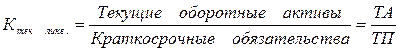 Должен быть больше или равен 2. Он показывает, сколько рублей текущих активов предприятия приходится на один рубль текущих обязательств. Он позволяет узнать, в какой степени текущие активы покрывают краткосрочные обязательства.